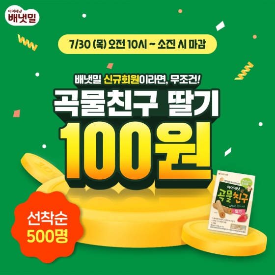 À̺¥Æ® ½ÃÀÛÀÏÀÎ 30ÀϺÎÅÍ ¹è³Á¹Ð¸ô¿¡ ½Å±Ô °¡ÀÔÇÑ »ç¶÷Àº ¼±Âø¼ø 500¸í¿¡ ÇÑÇØ ¾ÆÀ̹è³ÁÀÇ Àα⠰£½Ä Á¦Ç°ÀÎ ¡®°î¹°Ä£±¸ µþ±â¡¯¸¦ 100¿ø¿¡ ±¸¸ÅÇÒ ¼ö ÀÖ´Ù.