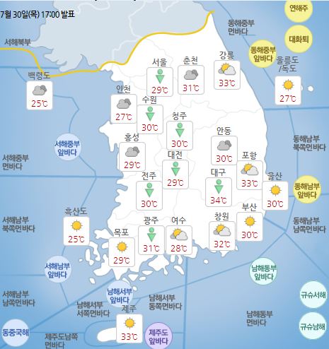 (±â¿Â) °¿øµ¿ÇؾȰú °æ»óµµ, Àü³², Á¦ÁÖµµ¿¡ Æø¿°ÁÖÀǺ¸°¡ ¹ßÇ¥µÈ °¡¿îµ¥, ¸ð·¹(8¿ù 1ÀÏ)±îÁö ³· ±â¿ÂÀÌ 31µµ ³»¿Ü·Î ¿À¸£´Â °÷ÀÌ ¸¹°Ú°í, ÀϺΠÁö¿ª¿¡¼´Â ½Àµµ°¡ ³ô¾Æ ü°¨¿Âµµ°¡ 33µµ ÀÌ»óÀ¸·Î ¿À¸£¸é¼ ¸Å¿ì ´þ°Ú°í, ¿´ë¾ß°¡ ³ªÅ¸³ª´Â °÷ÀÌ ÀÖ°ÚÀ¸´Ï, Æø¿° ¿µÇ⿹º¸(30ÀÏ 11½Ã 30ºÐ ¹ßÇ¥)¸¦ Âü°íÇÏ¿© °Ç°°ü¸®¿Í ³ó¾÷, Ãà»ê¾÷, »ê¾÷ µîÀÇ ÇÇÇØ°¡ ¾øµµ·Ï °¢º°È÷ À¯ÀÇÇϱ⠹ٶõ´Ù.
