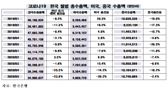 Äڷγª19°¡ °¡Àå ½É°¢Çß´ø 2020³â 5¿ù Çѱ¹ ÃÑ ¼öÃâ¾×Àº 349¾ï ´Þ·¯·Î 2019³â 5¿ù 457¾ï ´Þ·¯º¸´Ù 24% °¨¼ÒÇß´Ù. 2020³â 5¿ù Áß±¹ ¼öÃâ¾×Àº 107¾ï ´Þ·¯·Î Àü³â µ¿±â 110¾ï ´Þ·¯º¸´Ù 2% ÁÙ¾ú´Ù. ¹Ì±¹ ¼öÃâÀº 2020³â 5¿ù 46¾ï ´Þ·¯·Î Àü³â µ¿±â 65¾ï ´Þ·¯º¸´Ù ¹«·Á 29% °¨¼ÒÇß´Ù. Äڷγª19·Î ÀÎÇÏ¿© ¹Ì±¹ ¼öÃâ¾×ÀÌ ±Þ°¨ÇÑ °ÍÀ» ¾Ë ¼ö ÀÖ´Ù.