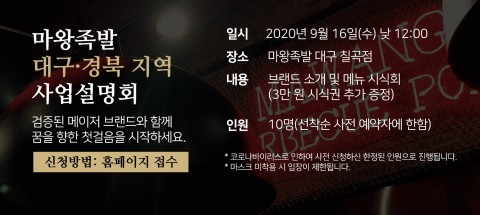 À̹ø ´ë±¸¡¤°æºÏ Áö¿ª »ç¾÷¼³¸íȸ´Â 9¿ù 16ÀÏ ¼ö¿äÀÏ ³· 12½Ã ¸¶¿ÕÁ·¹ß ´ë±¸ Ä¥°îÁ¡¿¡¼ ¿¸°´Ù.