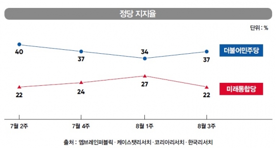 Çѱ¹°¶·´ÀÇ °æ¿ì 8¿ù 2ÁÖ ¹ÎÁÖ´çÀÌ 33%, ÅëÇÕ´çÀÌ 27%¸¦ ±â·ÏÇØ µÎ Á¤´çÀÇ Â÷ÀÌ´Â 6%p¿´´Ù. 8¿ù 3ÁÖ¿¡´Â ¹ÎÁÖ´çÀÌ 39%¸¦, ÅëÇÕ´çÀÌ 23%¸¦ ±â·ÏÇØ ´Ù½Ã ±× °ÝÂ÷°¡ ¹ú¾îÁ³´Ù.