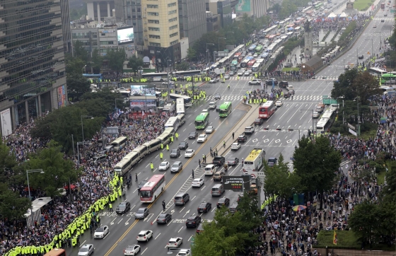 | ¡ã8.15ÀÏ ±¤È¹® Áýȸ¸¦ ±âÁ¡À¸·Î ¹ÎÁÖ´ç°ú ¹®ÀçÀÎ ´ëÅë·ÉÀÇ ÁöÁöÀ²ÀÌ ¹ÝµîÇß´Ù.»çÁøÀº ±¤È¹® ³×°Å¸®¼ ÁýȸÇÏ´Â º¸¼ö´Üü/»çÁø=´º½Ã½º |