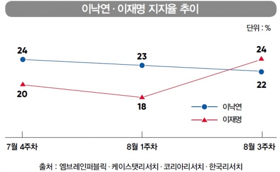 8¿ù 1, 2ÁÖ¿¡´Â ¹ÎÁÖ´çÀÇ ÁöÁöÀ²ÀÌ Ç϶ôÇß°í ÅëÇÕ´çÀÇ ÁöÁöÀ²ÀÌ ¿Ã¶ú´Ù. ¶Ç´Ù½Ã 8¿ù 3ÁÖ¿¡´Â ¹ÎÁÖ´çÀÌ ÁöÁöÀ²À» ȸº¹, ÅëÇÕ´ç°úÀÇ °ÝÂ÷°¡ ¹ú¾îÁö´Â Ãß¼¼¸¦ º¸¿´´Ù. ½ÅÁ¾ Äڷγª ¹ÙÀÌ·¯½º °¨¿°Áõ(Äڷγª19) ÀçÈ®»ê°ú °ü·ÃÇØ ÁöÁöÃþ °áÁý ¹× ¿©´ç¿¡ ÈûÀ» ½Ç¾îÁà¾ß ÇÑ´Ù´Â ¿©·Ð°ú, Àü±¤ÈÆ ¼ººÏ »ç¶ûÁ¦Àϱ³È¸ ´ãÀÓ¸ñ»ç µî ÀϺΠ±Ø¿ì¼¼·Â¿¡ ´ëÇÑ ±¹¹ÎµéÀÇ ¹Ý°¨ÀÌ ÀÛ¿ëÇß´Ù´Â ÆòÀÌ´Ù.
