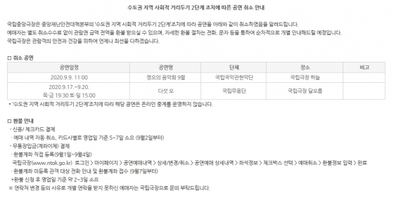 ´çÃÊ °ø¿¬ ¿¹Á¤ÀÌ´ø ¿À´Â 9¿ù 9ÀÏ ¿ÀÀü 11½Ã ¡®Á¤¿ÀÀÇ À½¾Çȸ 9¿ù(±¹¸³±¹¾Ç°üÇö¾Ç´Ü)¡¯ , 9¿ù 17ÀÏ~20ÀÏ ´Ù¼¸ ¿À(±¹¸³¹«¿ë´Ü)ÀÇ °ø¿¬À» Ãë¼ÒÇß´Ù.
