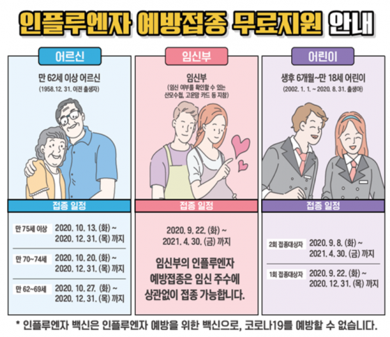 ¿¬·Éº° Á¢Á¾±â°£Àº ¡ã¾î¸°ÀÌ »ý¾Ö ù Á¢Á¾ µî 2ȸ Á¢Á¾´ë»óÀÚ (2020.9.8.~2021.4.30.) ¡ã¾î¸°ÀÌ 1ȸ Á¢Á¾´ë»óÀÚ (2020.9.22.~2020.12.31.) ¡ã¸¸ 75¼¼ ÀÌ»ó (2020.10.13.~2020.12.31.) ¡ã¸¸ 70¼¼~74¼¼ (2020.10.20.~2020.12.31.) ¡ã¸¸ 62¼¼~69¼¼ (2020.10.27.~2020.12.31.) ¡ãÀӽźΠ(2020.9.22.~2021.4.30.)ÀÌ´Ù.