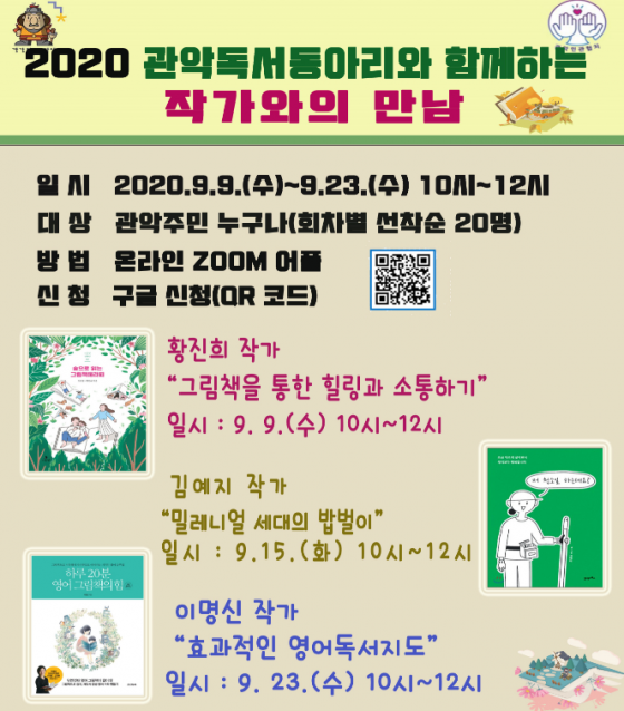 ÀúÀÚÀÇ Ã¥ ¼Ò°³¿Í ÇÔ²² ´Ù¾çÇÑ »îÀÇ ¹æ½ÄÀ» ³ª´ ¼ö ÀÖ´Â ½Ã°£À¸·Î ±¸¼ºµÈ À̹ø Çà»ç´Â ¡ã9¿ù 9ÀÏ(¼ö) ȲÁøÈñ ÀÛ°¡ÀÇ ¡®±×¸²Ã¥À» ÅëÇÑ Èú¸µ°ú ¼ÒÅëÇϱ⡯ ¡ã9¿ù 15ÀÏ(È) ±è¿¹Áö ÀÛ°¡ÀÇ ¡®¹Ð·¹´Ï¾ó¼¼´ëÀÇ ¹ß¹ýÀÌ¡¯ ¡ã9¿ù 23ÀÏ(¼ö) À̸í½Å ÀÛ°¡ÀÇ ¡®È¿°úÀûÀÎ ¿µ¾îµ¶¼Áöµµ¡¯¸¦ ÁÖÁ¦·Î È»óȸÀÇ ¾Û(ZOOM)À» Ȱ¿ëÇÑ Àü¸é ºñ´ë¸é ¹æ½ÄÀ¸·Î ÁøÇàµÈ´Ù.