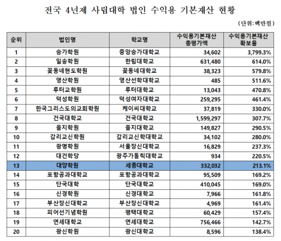 ¼¼Á¾´ëÇб³(ÃÑÀå ¹è´öÈ¿)´Â ±Ý³âÀÌ Ã¢¸³ 80³âÀÌ´Ù. THE ¼¼°è´ëÇÐÆò°¡¿¡¼ ±¹³» ¼øÀ§ 9À§¿¡ ¿À¸£¸ç °¡Àå Å« ÆøÀ¸·Î »ó½ÂÇß´Ù. ÀçÁ¤°ÇÀü¼ºÀº ±¹³» ÃÖ°í ¼öÁØÀÌ´Ù. Çб³¹ýÀÎ ´ë¾çÇпøÀÇ ¼öÀÍ¿ë ±âº»Àç»ê È®º¸À²Àº 213%·Î ±¹³» 13À§ÀÌ´Ù. ÀçÁ¤°ÇÀü¼ºÀÌ ¸Å¿ì ¿ì¼öÇϰí, ¾ÈÁ¤ÀûÀÎ Áö¿øÀÌ ´ëÇйßÀüÀÇ Å« ¿øµ¿·ÂÀÌ´Ù. ±¹³» »ç¸³´ëÇÐ 146°³¿¡¼ ¼öÀÍ¿ë ±âº»Àç»ê È®º¸À²ÀÌ 100%°¡ ³Ñ´Â ´ëÇÐÀº 39°³ ´ëÇлÓÀÌ´Ù.