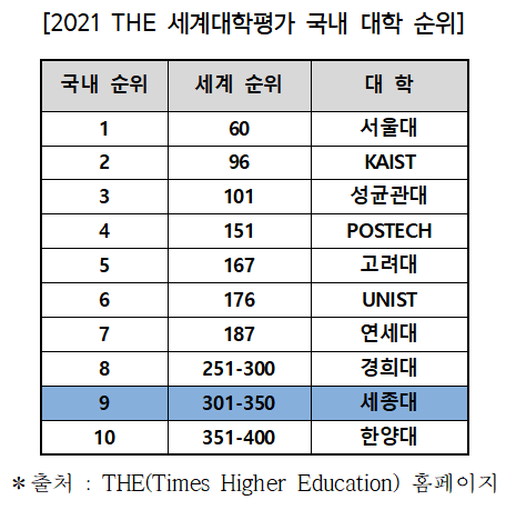 ¿µ±¹ °íµî±³À°Æò°¡ ±â°üÀÎ THE(Times Higher Education)´Â ¼¼°è ÃÖ°íÀÇ ´ëÇÐÆò°¡ ±â°üÀÌ´Ù. ¼¼Á¾´ë´Â¡®2021 THE ¼¼°è´ëÇÐÆò°¡¡¯¿¡¼ À۳⠴ëºñ ÇÑ ´Ü°è »ó½ÂÇÑ ±¹³» 9À§¸¦ Â÷ÁöÇß´Ù. ¼¼°è´ëÇÐ ¼øÀ§¿¡¼µµ 301~350À§±ÇÀ¸·Î ÁøÀÔÇÏ¸ç ±¹³»¿Í ÇØ¿Ü¿¡¼ ÃÖ°íÀÇ »ó½Â·üÀ» ±â·ÏÇß´Ù.
