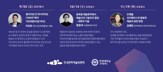 Çѱ¹¹®È¿¹¼úÀ§¿øÈ¸(ÀÌÇÏ ¿¹¼úÀ§, À§¿øÀå ¹ÚÁ¾°ü)¿Í ÇѾç´ëÇб³ »êÇÐÇù·Â´Ü(ÀÌÇÏ ÇѾç´ë, ´ëÇ¥ Çϼº±Ô)Àº <¿¹¼ú°ú ±â¼úÀÇ ¼ÒÅë>À» ÁÖÁ¦·Î ¡®¾ÆÆ®¾ØÅ×Å© ¹Ô¾÷µ¥ÀÌ(ART & TECH MEET-UP DAY)¡¯¸¦ °³ÃÖÇÑ´Ù°í 17ÀÏ ¹àÇû´Ù. ¾ÆÆ®¾ØÅ×Å© ¹Ô¾÷µ¥ÀÌ´Â <2020³â ¾ÆÆ®¾ØÅ×Å© Ȱ¼ºÈ »ç¾÷>ÀÇ ¿¬°è Çà»ç·Î ¿À´Â 25ÀÏ, 10¿ù 14ÀÏ, 11¿ù 19ÀϱîÁö ÃÑ 3ȸ¿¡ °ÉÃÄ ±â¼úÁ¢¸ñ ¿¹¼úâÀÛ ºÐ¾ßÀÇ Àü¹®°¡µéÀ» ÃÊÃ»ÇØ ºñ´ë¸é ¿Â¶óÀÎ °¿¬À» ÁøÇàÇÑ´Ù.