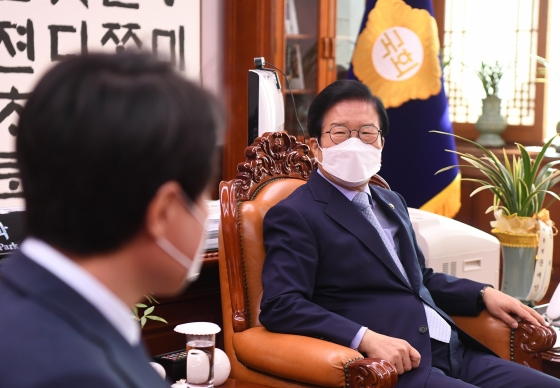| ¡ã¹Úº´¼® ±¹È¸ÀÇÀåÀÌ 13ÀÏ ¿ÀÀü ¼¿ï ¿©Àǵµ ±¹È¸ ÀÇÀå½Ç¿¡¼ ±èÁ¾Ã¶ Á¤ÀÇ´ç ½ÅÀÓ ´ëÇ¥¸¦ ¸¸³ª ´ëÈÇϰí ÀÖ´Ù./»çÁø=°øµ¿ÃëÀç»çÁø |