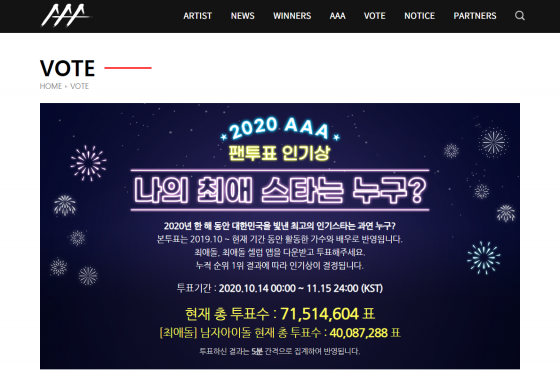 ÅõÇ¥´Â 'ÃÖ¾Öµ¹' ¹× 'ÃÖ¾Öµ¹ ¼¿·´' ¾Û »óÀÇ º¸À¯ ÇÏÆ® °³¼ö´ë·Î ÅõÇ¥°¡ °¡´ÉÇϸç, ¸ðµç ÅõÇ¥ ÇöȲ ¹× °á°ú´Â AAA °ø½Ä ȨÆäÀÌÁö¿Í STAR POLL ¾Û, ±×¸®°í 'ÃÖ¾Öµ¹', 'ÃÖ¾Öµ¹ ¼¿·´' ¾ÛÀ» ÅëÇØ °ø°³µÈ´Ù.