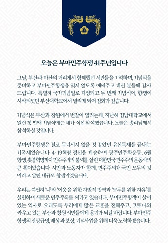 ¹®ÀçÀÎ ´ëÅë·ÉÀº 16ÀÏ ÆäÀ̽ººÏÀ» ÅëÇØ "ºÎ¸¶¹ÎÁÖÇ×ÀïÀº °áÄÚ ¹«³ÊÁöÁö ¾ÊÀ» °Í °°¾Ò´ø À¯½Åµ¶À縦 ³¡³»´Â ±âÆøÁ¦¿´´Ù"¸ç "4¡¤19Çõ¸í Á¤½ÅÀ» °è½ÂÇÏ¿© ±¤ÁÖ¹ÎÁÖȿ, 6¿ùÇ×Àï, ÃкÒÇõ¸í±îÁö ¹ÎÁÖÁÖÀÇÀÇ ºÒ¾¾¸¦ »ì¸° ´ëÇѹα¹ ¹ÎÁÖÁÖÀÇ ¿îµ¿»çÀÇ Å« ȹÀ̾ú´Ù"°í Çß´Ù.