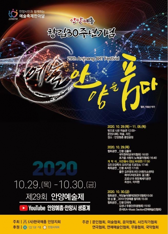 Á¦29ȸ ¾È¾ç¿¹¼úÁ¦ °³¸· °ø¿¬Àº ¡°¾È¾ç½Ã¡±¿Í ¡°¾È¾ç¿¹ÃÑ¡± À¯Æ©ºê ä³Î¼ 10¿ù 29ÀÏ 17:30 ºÐ »ý¹æ¼ÛÀ¸·Î ½Ãû ÇÒ ¼ö ÀÖ´Ù.