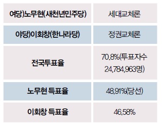 31³â ¸¸¿¡ ¾ç° ´ë°á·Î Ä¡·¯Áø 16´ë ´ë¼±¿¡¼´Â ¡®ºÎÆÐÁ¤±Ç ½ÉÆÇ¡¯°ú ¡®Á¤±Ç±³Ã¼¡¯¸¦ ³»¼¼¿î ÀÌȸâ Çѳª¶ó´ç Èĺ¸¿Í ¡®³°Àº Á¤Ä¡ û»ê¡¯°ú ¡®Á¤Ä¡ ¼¼´ë±³Ã¼¡¯¸¦ ³»¼¼¿î ³ë¹«Çö ¹ÎÁÖ´ç È帰¡ ¸ÂºÙ¾ú´Ù.