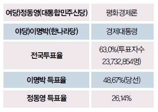 ´ë¼± °á°ú 1³â¿©¸¦ ÁöÁöÀ² 1À§·Î µ¶ÁÖÇÑ ³¡¿¡ À̸í¹ÚÀÌ °ú¹ÝÀÌ ³Ñ´Â µæÇ¥·Î 17´ë ´ëÅë·É ¼±°Å¿¡ ´ç¼±µÆ´Ù. ±¹¹ÎµéÀº ³²³à³ë¼Ò¸¦ °¡¸®Áö ¾Ê°í ÀÌ ´ç¼±ÀÚ¸¦ ÇâÇØ ¡®°æÁ¦ »ì¸®±â¡¯¸¦ ÁÖ¹®Çß´Ù.