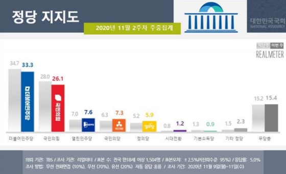 ¿©·ÐÁ¶»ç Àü¹®±â°üÀÎ ¸®¾ó¹ÌÅͰ¡ 12ÀÏ ¹ßÇ¥ÇÑ 11¿ù 2ÁÖ Â÷ ÁÖÁß µ¿Çâ¿¡ µû¸£¸é ¹ÎÁÖ´çÀº ¼¿ï¿¡¼ 33.3%, ±¹¹ÎÀÇÈûÀº 28.9%ÀÇ ÁöÁöÀ²À» ±â·ÏÇß´Ù. ±× µÚ¸¦ ±¹¹ÎÀÇ´çÀÌ 7.7%, ¿¸°¹ÎÁÖ´çÀÌ 6.0%, Á¤ÀÇ´çÀÌ 4.9%, ¹«´çÃþÀÌ 14.4%, ¾øÀ½ÀÌ 11.3%·Î ³ªÅ¸³µ´Ù.