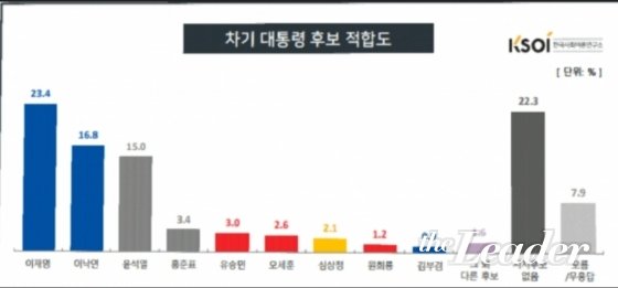 Çѱ¹»çȸ¿©·Ð¿¬±¸¼Ò(KSOI)ÀÇ 12¿ù Â÷±â´ë¼± ÁöÁöµµ(ÀûÇÕµµ) Á¶»ç¿¡¼, ÀÌÀç¸í °æ±âµµÁö»ç°¡ Áö³´Þ 11¿ù Á¶»ç ´ëºñ 2.5%p »ó½ÂÇÑ 23.4%¸¦ ±â·ÏÇϸç 2À§ À̳«¿¬ ¹ÎÁÖ´ç ´ëÇ¥¿¡ ¿ÀÂ÷¹üÀ§(¡¾3.1%p) ¹ÛÀÎ 6.6%p ¾Õ¼± 1À§¿¡ ¿À¸¥ °ÍÀ¸·Î ³ªÅ¸³µ´Ù. ÀÌÀç¸í Áö»ç°¡ Â÷±â´ë¼± Á¶»ç¿¡¼ ¿ÀÂ÷¹üÀ§ ¹Û¿¡¼ ¼±µÎ¸¦ ±â·ÏÇÑ °ÍÀº Çѱ¹°¶·´, NBS Á¶»ç µî ÁÖ¿ä Á¤±âÁ¶»ç¸¦ ÅëÆ²¾î À̹øÀÌ Ã³À½ÀÌ´Ù.
