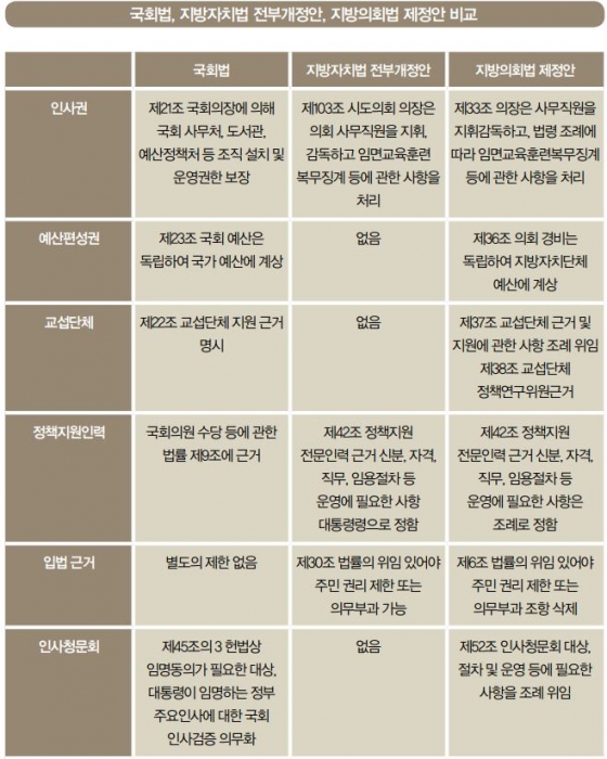 ¢ºÁö¹æÀÚÄ¡¹ý ÀüºÎ°³Á¤¾È¿¡ Á¤Ã¥Áö¿ø Àü¹®ÀηÂÀ» ÀÇ¿ø Á¤¼öÀÇ 2ºÐÀÇ 1 ±Ô¸ð·Î Ãà¼ÒÇÑ °Í, ÀÇȸ »ç¹«Ã³ Á÷¿ø ¼ö¸¦ Á¶·Ê°¡ ¾Æ´Ñ ´ëÅë·É·ÉÀ¸·Î Á¤Çϵµ·Ï ÇÑ °ÍÀº ¾Æ½¬¿òÀÌ ³²´Â ´ë¸ñÀÌ´Ù. ÀÇȸÀÇ Á¶Á÷±¸¼º±Ç, ¿¹»êÆí¼º±Ç µîÀº ¿©ÀüÈ÷ ÀÇȸ°¡ ¾Æ´Ñ Áß¾ÓÁ¤ºÎ¿Í Áö¹æÀÚÄ¡´Üü¿¡ ±Í¼ÓµÅ ÀÖ´Ù. ƯÈ÷ ½ÇÁúÀûÀÎ ÀÇȸ¿î¿µÀÇ ÁÖüÀÎ ±³¼·´Üü¿¡ ´ëÇÑ ¹ýÀûÀÎ ±Ù°Å°¡ ¾ø´Ù. Áö¹æÀÇȸ´Â Áö¹æÀÚÄ¡ÀÇ ÇÑ ÃàÀÌ´Ù. Áö¹æÀÇȸÀÇ ¹ßÀüÀ» À§Çؼ´Â ±¹È¸¹ý°ú °°ÀÌ µ¶¸³ÀûÀÎ Áö¹æÀÇȸ¹ý Á¦Á¤À» ÅëÇØ ÀÇȸÁ¶Á÷°ú ¿¹»êÆí¼º±Ç µ¶¸³, ±³¼·´Üü¿¡ ´ëÇÑ ±Ù°Å¸¦ ¸¶·ÃÇØ¾ß ÇÑ´Ù. ±¹È¸¹ýó·³ °¢ Áö¹æÀÇȸ ¿©°Ç¿¡ ¸Â´Â Á¶Á÷ ¿î¿µ°ú ÀÎ·Â Ãæ¿øÀÌ °¡´ÉÇϵµ·Ï ÇØ¾ß ÇÑ´Ù.