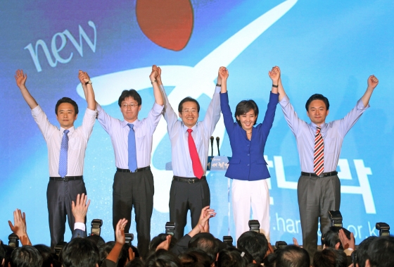 | ¡ã2011³â 7¿ù ¼¿ï ¼ÛÆÄ±¸ ¿Ã¸²ÇȰø¿ø üÁ¶°æ±âÀå¿¡¼ ¿¸° Á¦12Â÷ Çѳª¶ó´ç Àü´ç´ëȸ¿¡¼ ´ëÇ¥ÃÖ°íÀ§¿øÀ¸·Î ´ç¼±µÈ È«ÁØÇ¥ ÀÇ¿ø(°¡¿îµ¥)ÀÌ ÃÖ°íÀ§¿ø ´ç¼±ÀÚµé°ú ÇÔ²² ¼ÕÀ» ¸ÂÀâ°í ¸¸¼¼¸¦ ºÎ¸£°í ÀÖ´Ù. ¿ÞÂʺÎÅÍ ³²°æÇÊ, À¯½Â¹Î, È«ÁØÇ¥, ³ª°æ¿ø, ¿øÈñ·æ./»çÁø=¸Ó´ÏÅõµ¥ÀÌ |