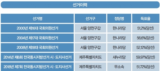 ¿ø Áö»ç´Â ¡®¼±°Å ºÒÆÐ¡¯¸¦ ±â·ÏÇÑ´Ù. 16,17,18´ë ±¹È¸ÀÇ¿øÀ¸·Î Ȱµ¿ÇÑ ÀÌÈÄ 19´ë ÃѼ±À» ¾ÕµÎ°í ºÒÃ⸶ ¼±¾ðÀ» Çß´Ù. 2014³â Á¦6ȸ Áö¹æ¼±°Å¿¡¼ Á¦ÁÖµµÁö»ç·Î Ãâ¸¶ÇØ 59.97%ÀÇ µæÇ¥À²·Î ¹«³È÷ ´ç¼±±æ¿¡ ¿Ã¶ú´Ù. ¹Ú±ÙÇý-ÃÖ¼ø½Ç °ÔÀÌÆ®°¡ ÅÍÁø 2017³â, »õ´©¸®´çÀ» Å»´çÇÏ°í ¹Ù¸¥Á¤´ç¿¡ ÀÔ´çÇß´Ù. 2018³â ¹Ù¸¥Á¤´ç°ú ±¹¹ÎÀÇ´çÀÌ ÇÕ´çÇÏÀÚ ÀÌ¿¡ ¹Ý´ëÇÏ°í ¹«¼Ò¼ÓÀ¸·Î Á¦7ȸ Áö¹æ¼±°Å¿¡ ³ª¼¹´Ù. ¿ø Áö»ç´Â µæÇ¥À² 51.72%¸¦ ±â·Ï, Àç¼±À» À̾°í ÀÖ´Ù. Áö³ÇØ 2¿ù ¹Ì·¡ÅëÇÕ´çÀ¸·Î ´Ù½Ã µé¾î¿Í ÇöÀç´Â ±¹¹ÎÀÇÈû ¼Ò¼ÓÀÌ´Ù.