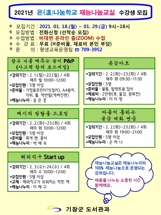 ¶ÇÇÑ ±âÀ屺Àº Àç´É³ª´®ºÀ»ç´ÜÀ» »ó½Ã ¸ðÁýÇϰí ÀÖ´Ù. ±³À°/Çй®, ¾îÇÐ, °Ç°, ÄÄÇ»ÅÍ/Åë½Å, À½¾Ç, ¹Ì¼ú/°ø¿¹, °¡Á¤/»ýȰ, ±âŸ µî °¢ ºÐ¾ßº° ÇнÀ¡¤°æÇ衤Àç´ÉÀ» °øÀ¯ÇÒ ¼ö ÀÖ´Â ´©±¸³ª Áö¿ø °¡´ÉÇÏ´Ù. Èñ¸ÁÀÚ´Â Àç´É³ª´®ºÀ»ç´Ü ½Åû¼, °Àǰèȹ¼¸¦ ÀÛ¼ºÇÏ¿© ½ÅûÇÏ¸é µÈ´Ù.