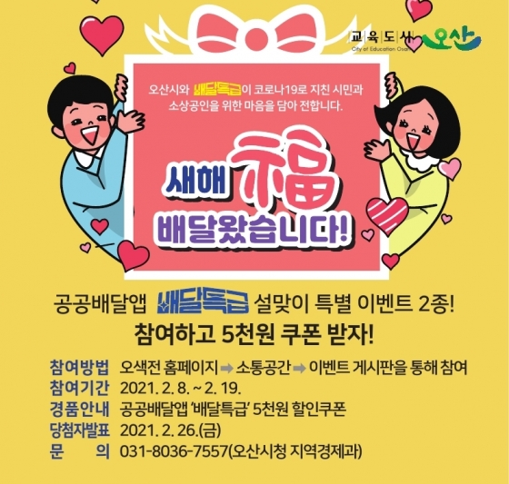 °æ±âµµ ¿À»ê½Ã(½ÃÀå °û»ó¿í)°¡ °ø°ø¹è´Þ¾Û '¹è´ÞƯ±Þ'ÀÇ ¼³¸ÂÀÌ Æ¯º°À̺¥Æ® ¡®»õÇØ ÜØ ¹è´Þ¿Ô½À´Ï´Ù!¡¯¸¦ ½Ç½ÃÇÑ´Ù°í 9ÀÏ ¹àÇû´Ù. À̹ø À̺¥Æ®´Â °æ±âµµ ¹è´Þ¾ÛÀÎ '¹è´ÞƯ±Þ¡¯ÀÇ ½Å±Ô ÀÌ¿ëÀÚ È®º¸¿Í Áö¿ªÈÆó »ç¿ë ÃËÁøÀ» À§ÇØ 2¿ù 8ÀϺÎÅÍ 2ÁÖ°£ ½Ç½ÃÇÑ´Ù. ÀÌ ±â°£ ¹è´ÞƯ±Þ ¾Û¿¡¼ Áö¿ªÈÆó °áÁ¦ ¶§ »ç¿ëÇÒ ¼ö ÀÖ´Â ¡®5õ¿ø ÇÒÀÎÄíÆù¡¯À» Áö±ÞÇÑ´Ù.