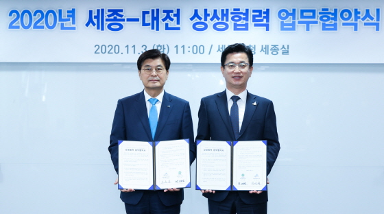 | ÇãÅÂÁ¤ ´ëÀü½ÃÀå(¿À¸¥ÂÊ)°ú ÀÌÃáÈñ ¼¼Á¾½ÃÀåÀÌ Áö³ÇØ 11¿ù 3ÀÏ ¼¼Á¾½Ãû ¼¼Á¾½Ç¿¡¼ ¡®2020³â ´ëÀü-¼¼Á¾ »ó»ýÇù·Â ¾÷¹«Çù¾à¡¯À» ü°áÇÑ µÚ ±â³äÃÔ¿µÇϰí ÀÖ´Ù./»çÁø=´ëÀü½Ã Á¦°ø |