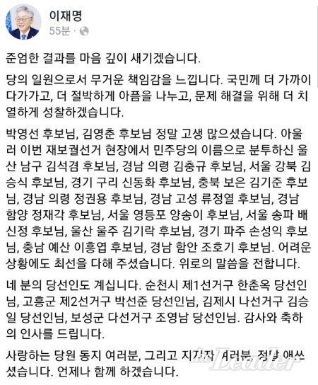 À̾î "´õ Àý¹ÚÇÏ°Ô ¾ÆÇÄÀ» ³ª´©°í, ¹®Á¦ ÇØ°áÀ» À§ÇØ ´õ Ä¡¿ÇÏ°Ô ¼ºÂûÇϰڴÙ"°í ¹àÈ÷¸ç, ³«¼±Àε鿡 ´ëÇÑ À§·ÎÀÇ ¸»°ú ´ç¼±Àε鿡°Ô ´ëÇÑ °¨»ç¿Í ÃàÇÏÀÇ Àλ縦 °Ç³Þ´Ù.