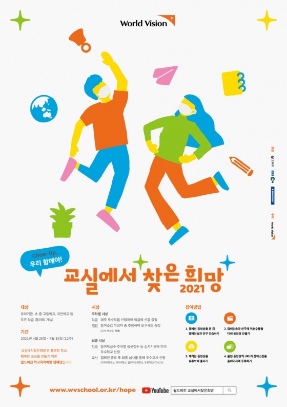 ¡®2021 ±³½Ç¿¡¼ ãÀº Èñ¸Á¡¯ Ä·ÆäÀÎ ¿ÃÇØ·Î 10ȸ¸¦ ¸Â¾Æ ¡®Cheer up, ¿ì¸® ÇÔ²²¾ß¡¯¶ó´Â ÁÖÁ¦·Î ÁøÇàÇÑ´Ù. Äڷγª19·Î ÀÎÇØ ´ä´äÇÑ ÀÏ»óÀ» º¸³»°í ÀÖ´Â ¾ÆÀ̵éÀÇ ÀÏ»ó ȸº¹À» ÀÀ¿øÇϸç, ¡®¿ì¸®´Â ¿¬°áµÇ¾î ÀÖ´Ù¡¯´Â ¸Þ½ÃÁö¸¦ ´ã¾Ò´Ù. Âü¿© ±â°£Àº ¿À´Â 7¿ù 16ÀϱîÁö¸ç Àü±¹ ÃÊÁß°í ÇÐ±Þ ¹× µ¿¾Æ¸® ´ÜÀ§·Î Áö¿ø °¡´ÉÇÏ´Ù.