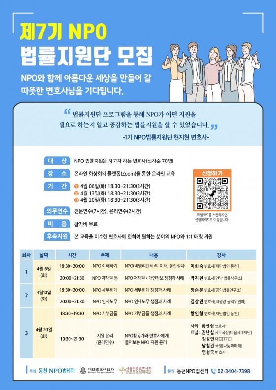µ¿ÃµNPO´Â ¸ÅÁÖ È¿äÀÏ¿¡ ºñ¿µ¸®´Üü(NPO, Non-Profit Organization) ¹ý·üÁö¿ø Ȱµ¿(ÇÁ·Îº¸³ë Ȱµ¿)À» ¼öÇàÇÒ º¯È£»ç ¾ç¼ºÀ» À§ÇÑ ¡®Á¦7±â NPO¹ý·üÁö¿ø´Ü¡¯ ¿¬¼ö ÇÁ·Î±×·¥À» ÁøÇàÇß´Ù.