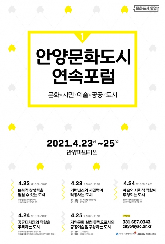 ¿¬¼ÓÆ÷·³Àº ÃÑ 5ȸ·Î ±¸¼ºµÇ¸ç, °¢°¢¡®¹®ÈÀû »ó»ó·ÂÀ» ÆîÄ¥ ¼ö ÀÖ´Â µµ½Ã¡¯,¡®°Å¹ö³Í½º¿Í ½Ã¹Î·ÂÀÌ ÀÛµ¿ÇÏ´Â µµ½Ã¡¯, ¡®¿¹¼úÀÇ »çȸÀû ¿ªÇÒÀÌ Åõ¿µµÇ´Â µµ½Ã¡¯, ¡®°ø°øµðÀÚÀÎÀÇ ¿ªÇÒÀ» ÁÖ¸ñÇÏ´Â µµ½Ã¡¯, ¡®Áö¿ª ¹®È ½Çõ µ¿·ÂÀ¸·Î¼ÀÇ °ø°ø¿¹¼úÀ» ±¸»óÇÏ´Â µµ½Ã¡¯ ÁÖÁ¦¼øÀ¸·Î 3ÀÏ¿¡ °ÉÃÄ ÁøÇàµÈ´Ù.