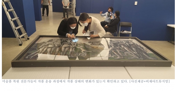 | ¡ã¹Ì¼úǰ º¹¿ø Àü¹®°¡µéÀÌ ÀÛǰ ¿î¼Û °úÁ¤¿¡¼ ÀÛǰ »óÅÂÀÇ º¯È°¡ ÀÖ´ÂÁö È®ÀÎÇϰí ÀÖ´Ù./»çÁø=ºñä¾ÆÆ®¹ÂÁö¾ö |