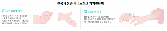 Ç㵿¹ü Á¤Çü¿Ü°ú Àü¹®ÀÇ(¿¬¼¼½ºÅ¸º´¿ø º´¿øÀå)´Â ¡°ÆÈ²ÞÄ¡ ÅëÁõÀÌ ÀÖ´Ù¸é ¸¸¼º ÅëÁõÀÌ ¿À±â Àü¿¡ ÆÈ²ÞÄ¡ »ç¿ëÀ» ÀÚÁ¦ÇØ¾ß ÇÑ´Ù. Å״Ͻº¿¤º¸ ÀÚ°¡Áø´ÜÀ» ÇØº¸¸é ÅëÁõÀ» üũÇÒ ¼ö ÀÖ´Ù. ¼Õ¸ñÀ» ±ÁÇû´Ù Æìº¸°Å³ª ¹°°ÇÀ» µé°í ¼Õ¸ñÀ» À§, ¾Æ·¡·Î Èçµé ¶§ ÆÈ²ÞÄ¡ ¹Ù±ù ÂÊ¿¡ ÅëÁõÀÌ ´À²¸Áö¸é Å״Ͻº¿¤º¸¸¦ ÀǽÉÇØ º¼ ¼ö ÀÖ´Ù. ¶Ç ÇϳªÀÇ Ã¼Å©¹æ¹ýÀº ÆÈÀ» ¾ÕÀ¸·Î Æì¼ °¡¿îµ¥ ¼Õ°¡¶ôÀ» ¾Æ·¡·Î ´©¸£¸é¼ ÆÈ²ÞÄ¡ ÅëÁõÀ» ¾Ë ¼ö ÀÖ´Ù. ÀÚ°¡Áø´ÜÀ» ÅëÇØ ÅëÁõÀÌ ´À²¸Áö¸é Àü¹®ÀǸ¦ ã¾Æ Ä¡·á¸¦ ¹Þ¾Æ¾ß ÇÑ´Ù¡±°í ÀüÇß´Ù.