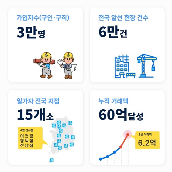 ÇöÀç Àϰ¡ÀÚÀηÂÀÇ ÀÏÀÚ¸®´Â °Ç¼³¡¤Åä¸ñ¡¤ÀÎÅ׸®¾î¡¤¹°·ù¼¾ÅÍ¡¤Ã¶°Å¡¤°øÀ塤À̻硤ÁذøÃ»¼Ò µî ´Ü±â ÀÏÀÚ¸® ºÐ¾ß 56°³ÀÇ Á÷Á¾°ú 1200°³ ¼¼ºÎ ÀÛ¾÷ ¿É¼ÇÀ¸·Î ±¸ºÐµÈ´Ù. »çÀü °ËÁõÀ» ÅëÇØ Àϰ¡ÀÚÀη¿¡ µî·ÏµÈ 100% ³»±¹ÀÎ ¡â±â°ø ¡âÁ¶°ø ¡âº¸Åë ÀκΠµîÀ» ÀÚü °³¹ßÇÑ IT ½Ã½ºÅÛÀ» ÅëÇØ ºñ´ë¸é¡¤½Ç½Ã°£À¸·Î ¾Ë¼±Çϰí ÀÖÀ¸¸ç, Àϰ¡ÀÚ ±¸ÀÎ-±¸Á÷ ¾ÛÀ» ÅëÇØ Àη ¿äû(È®ÀÎ)¡¤±ÙÅ ȮÀΡ¤»óÈ£ Æò°¡¡¤½Ç½Ã°£ ³ë¹« °ü¸® ¼ºñ½º¸¦ Á¦°øÇϰí ÀÖ´Ù.