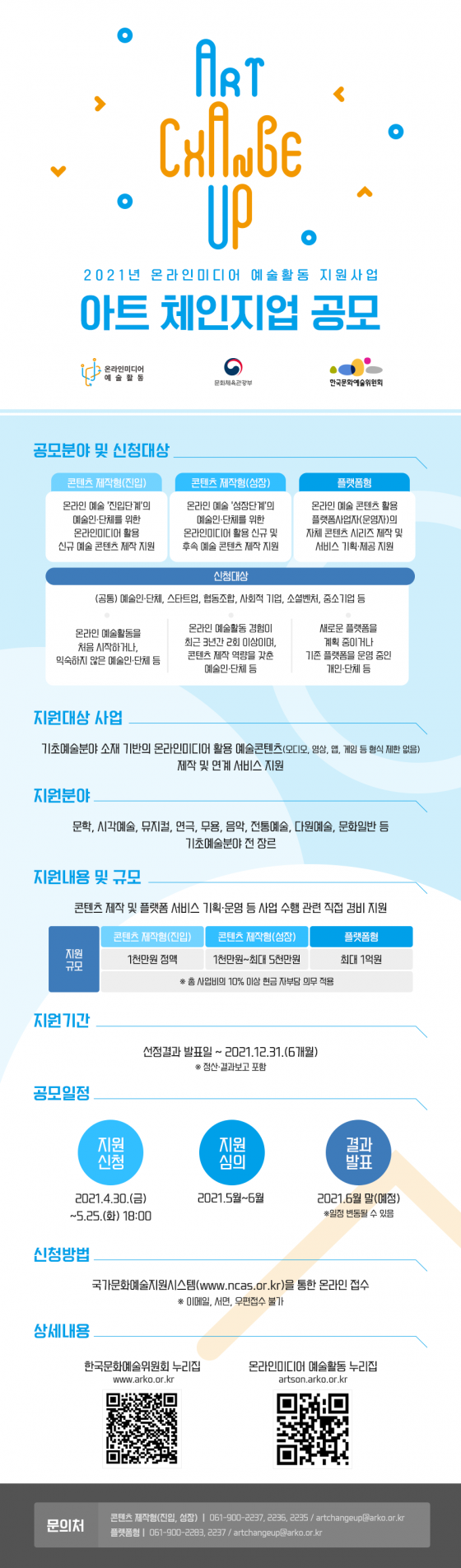 ¹®ÈüÀ°°ü±¤ºÎ(Àå°ü ȲÈñ, ÀÌÇÏ ¹®Ã¼ºÎ)¿Í Á¤ºÎ ´ëÇ¥ ¹®È¿¹¼úÁö¿ø ±â°üÀÎ Çѱ¹¹®È¿¹¼úÀ§¿øÈ¸(À§¿øÀå ¹ÚÁ¾°ü, ÀÌÇÏ ¹®¿¹À§)´Â ¡®¿Â¶óÀι̵ð¾î ¿¹¼úȰµ¿ Áö¿ø»ç¾÷¡¯ 2021³â °ø¸ð¸¦ ÃßÁøÇÑ´Ù. °ø¸ð»ç¾÷Àº ¡®¾ÆÆ® üÀÎÁö¾÷!¡¯À̶ó ¸í¸íÇß´Ù.