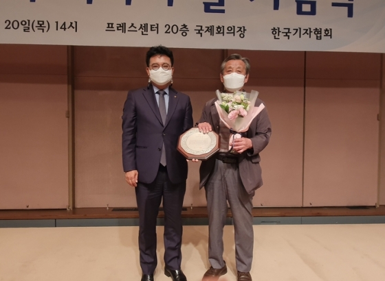 | ¡ãÁ¦16ȸ ±âÀÚÀÇ ³¯ ±â³ä½Ä¿¡¼ ´º½ºÅ¸ÆÄ ÇÔ²²Àç´Ü ±èÁß¹è ÀÌ»çÀå(¿À¸¥ÂÊ)ÀÌ '±âÀÚÀÇ È¥' »óÀ» ¼ö»óÇÏ°í ±èµ¿ÈÆ Çѱ¹±âÀÚÇùȸÀå°ú ±â³äÃÔ¿µÀ» Çϰí ÀÖ´Ù./»çÁø=Çѱ¹±âÀÚÇùȸ |