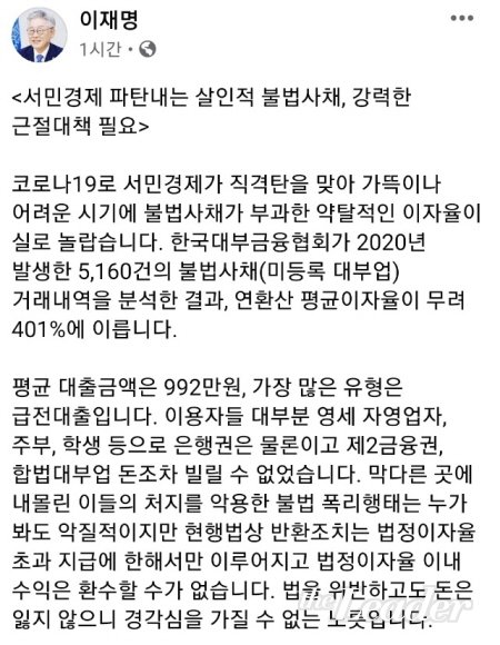 ÀÌÀç¸í Áö»ç´Â 27ÀÏ SNS¸¦ ÅëÇØ "Äڷγª19·Î ¼¹Î°æÁ¦°¡ Á÷°ÝźÀ» ¸Â¾Æ °¡¶àÀ̳ª ¾î·Á¿î ½Ã±â¿¡ ºÒ¹ý»çä°¡ ºÎ°úÇÑ ¾àÅ»ÀûÀÎ ÀÌÀÚÀ²ÀÌ ½Ç·Î ³î¶ø´Ù"¸ç "Çѱ¹´ëºÎ±ÝÀ¶Çùȸ°¡ 2020³â ¹ß»ýÇÑ 5,160°ÇÀÇ ºÒ¹ý»çä(¹Ìµî·Ï ´ëºÎ¾÷) °Å·¡³»¿ªÀ» ºÐ¼®ÇÑ °á°ú, ¿¬È¯»ê Æò±ÕÀÌÀÚÀ²ÀÌ ¹«·Á 401%¿¡ À̸¥´Ù"°í ¼³¸íÇß´Ù.
