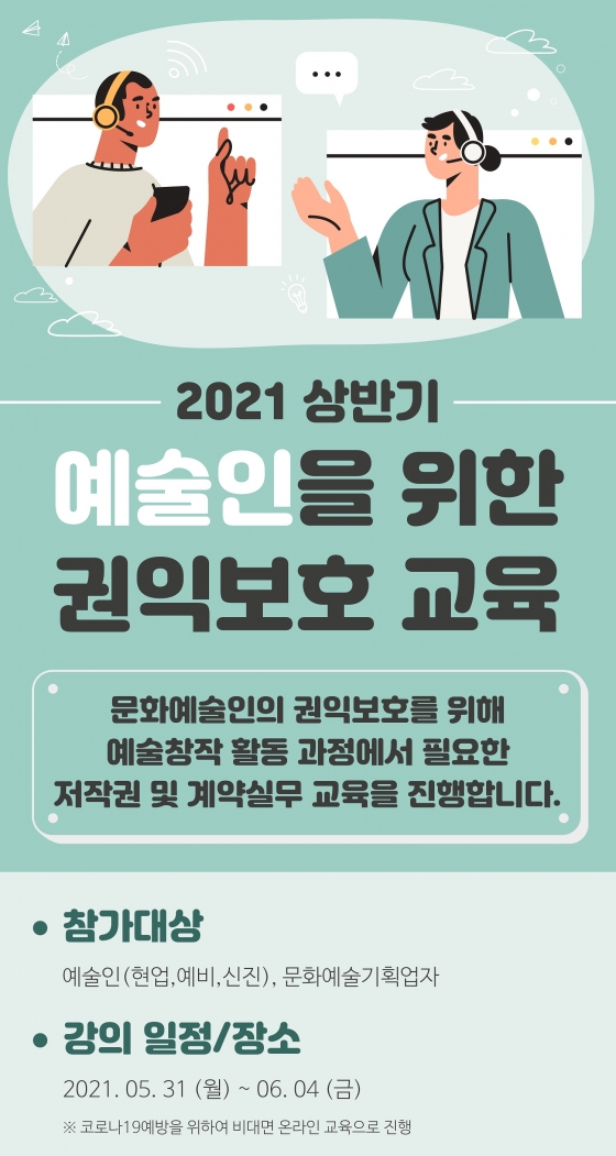 ¹®ÈüÀ°°ü±¤ºÎ(Àå°ü ȲÈñ)°¡ ÁÖÃÖÇϰí Çѱ¹¿¹¼úÀκ¹ÁöÀç´Ü(´ëÇ¥ ¹Ú¿µÁ¤)°ú Çѱ¹ÀúÀÛ±ÇÀ§¿øÈ¸(À§¿øÀå ÃÖº´±¸)°¡ °øµ¿À¸·Î ÁÖ°üÇÏ´Â 2021 »ó¹Ý±â <¿¹¼úÀÎÀ» À§ÇÑ ±ÇÀͺ¸È£ ±³À°>ÀÌ ¿À´Â 31ÀÏ(¿ù)ºÎÅÍ 6¿ù 4ÀÏ(±Ý)±îÁö ¿¸°´Ù.