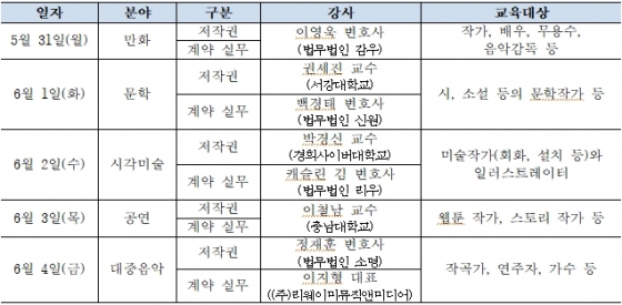ºÐ¾ß(´ë»ó: Àۻ硤ÀÛ°î°¡, ¿¬ÁÖÀÚ, °¡¼ö µî)·Î, ÀúÀÛ±Ç °úÁ¤Àº ¿ÀÀü 10½ÃºÎÅÍ ¿ÀÈÄ 1½Ã±îÁö ÁøÇàÇÑ´Ù. °è¾à ½Ç¹« °úÁ¤Àº ¿ÀÈÄ 2½ÃºÎÅÍ ¿ÀÈÄ 5½Ã±îÁö ÁøÇàµÇ¸ç, Çѱ¹¿¹¼úÀκ¹ÁöÀç´ÜÀÇ ÀÌ·¯ÇÑ ±³À°Àº ¸Å³â »ó¡¤ÇϹݱ⿡ Á¤±âÀûÀ¸·Î ÁøÇàµÇ°í ÀÖ´Ù.