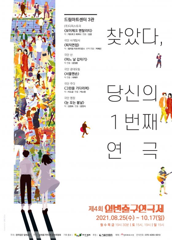 À̹ø¿¡ ¹«´ë¿¡ ¿Ã·ÁÁö´Â 6ÆíÀº (ÁÖ)µðÇǽºÅ丮ÀÇ <º¸ÀÌüũ ¸àÅ»¸®Æ¼>, ±Ø´Ü ¡®»ç°³Å½»ç¡¯ÀÇ <ÅðÁ÷ ¸éÁ¢>, ±Ø´Ü '»ê'ÀÇ <¾î´À ³¯ °©ÀÚ±â...!>, ±Ø´Ü ¡®±¤´ë¸ðµÒ¡¯ÀÇ <¼¿ï¸Ç¼ð>, ±Ø´Ü ¡®ÁÖ´Ù¡¯ÀÇ <±×¸°À» ±â´Ù¸®¸ç>, ±Ø´Ü ¡®¸íÀ塯ÀÇ <´« ¿À´Â º½³¯>·Î ¿À´Â 8¿ù 25ÀϺÎÅÍ 10¿ù 17ÀϱîÁö, ´ëÇзΠµå¸²¾ÆÆ®¼¾ÅÍ 3°ü¿¡¼ °ü°´°ú ¸¸³´Ù.