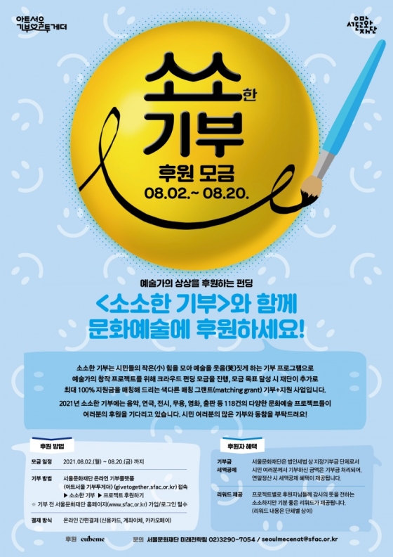 ½Ã¹ÎµéÀº ±âºÎ Ç÷§ÆûÀÎ ¡®¾ÆÆ®¼¿ï! ±âºÎÅõ°Ô´õ¡¯(www.givetogether.or.kr)¸¦ ÅëÇØ 3,000¿øºÎÅÍ 150¸¸ ¿ø±îÁö Ä«µå°áÁ¦, °èÁÂÀÌü, īī¿ÀÆäÀÌ µîÀÇ ¹æ¹ýÀ¸·Î ±âºÎÇÒ ¼ö ÀÖ´Ù. ±âºÎ Âü¿©ÀÚ´Â ¿¹¼ú´ÜüµéÀÌ ÁغñÇÑ ¼Ò¼ÒÇÏÁö¸¸ ¸¶À½ÀÌ ´ã±ä ÈÄ¿øÀÚ Ç¥±â µî °¨»ç Ç¥½ÃºÎÅÍ ÇÁ·ÎÁ§Æ® °ü·Ã ¿¹¼ú»óǰ±îÁö ´Ù¾çÇÑ ¸®¿öµå¸¦ ¹Þ´Â´Ù. ¶Ç, ¿¬¸»Á¤»ê ½Ã ÈÄ¿ø ±Ý¾×¿¡ ´ëÇÑ ±âºÎ±Ý ¼¼¾×°øÁ¦ ÇýÅõµ ¹ÞÀ» ¼ö ÀÖ´Ù.