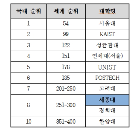 ¼¼Á¾´ëÇб³(ÃÑÀå ¹è´öÈ¿)´Â ¿µ±¹ °íµî±³À°Æò°¡ ±â°üÀÎ THE(Times Higher Education)°¡ ¹ßÇ¥ÇÑ ¡®2022 THE ¼¼°è´ëÇÐÆò°¡¡¯¿¡¼ ¼¼°è 251-300À§¿¡ ÁøÀÔÇß´Ù.