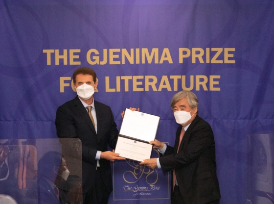 | ¡ãÁ¦18ȸ Á¦´Ï¸¶ ¹®Çлó ½Ã»ó½Ä¿¡¼ Á¦´Ï¸¶ ¹®Çлó À§¿øÈ¸ Àè ¸¶¸®³ªÀÌ(Gjeke Marinaj, ¿ÞÂÊ) ÀÇÀåÀÌ ÃÖµ¿È£ °í·Á´ë ¸í¿¹±³¼ö(¿À¸¥ÂÊ)¿¡°Ô »óÀåÀ» ¼ö¿©Çϰí ÀÖ´Ù.