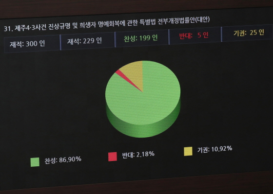 | Á¦ÁÖ 4¡¤3»ç°Ç Èñ»ýÀÚ¿¡°Ô ±¹°¡°¡ º¸»ó±ÝÀ» Áö±ÞÇÒ ±Ù°Å¸¦ ¸¶·ÃÇÑ 'Á¦ÁÖ 4¡¤3»ç°Ç Áø»ó±Ô¸í ¹× Èñ»ýÀÚ ¸í¿¹È¸º¹¿¡ °üÇÑ Æ¯º°¹ý °³Á¤¾È'ÀÌ 26ÀÏ ±¹È¸ º»È¸ÀÇ¿¡¼ Åë°úµÇ°í ÀÖ´Ù. Àç¼® 229ÀÎ Áß Âù¼º 199ÀÎ, ¹Ý´ë 5ÀÎ, ±â±Ç 25À¸·Î ¿©¾ß ÀÇ¿øµéÀÇ ÅõÇ¥ °á°ú°¡ ±¹È¸ º»È¸ÀÇÀå Àü±¤ÆÇ¿¡ Ç¥½ÃµÅ ÀÖ´Ù./»çÁø=°øµ¿ÃëÀç´Ü |
