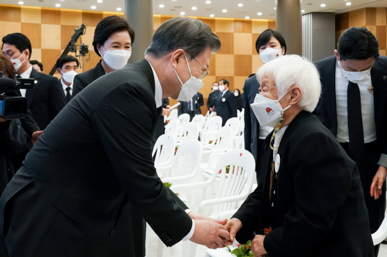 | ¹®ÀçÀÎ ´ëÅë·É°ú ±èÁ¤¼÷ ¿©»ç°¡ 4¿ù 3ÀÏ ¿ÀÀü Á¦ÁÖ 4¡¤3 Æòȱ³À°¼¾ÅÍ¿¡¼ ¿¸° Á¦73ÁÖ³â Á¦ÁÖ 4¡¤3 Èñ»ýÀÚ Ãß³ä½ÄÀ» ¸¶Ä£ÈÄ 4¡¤3 »ç°Ç ´ç½Ã ºÎ¸ð¿Í ¿Àºü¸¦ ÀÒÀº ¼Õ¹Î±Ô ¾î¸£½ÅÀ» À§·ÎÇϰí ÀÖ´Ù./»çÁø=´º½Ã½º |