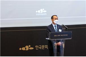 | ¡ã2021¿ÃÇØÀÇ ¿¹¼úÈÄ¿øÀÎ ´ë»ó¿¡¼ Çѱ¹¹®È¿¹¼úÀ§¿øÈ¸ ¹ÚÁ¾°ü À§¿øÀåÀÌ ¼±Á¤µÈ ´Üü¿Í ±â¾÷ °³Àο¡ ¼ö»ó¿¡ ¾Õ¼ °¨»çÀÇ Àλ縦 ÀüÇϰí ÀÖ´Ù./»çÁø=Çѱ¹¹®È¿¹¼úÀ§¿øÈ¸ |