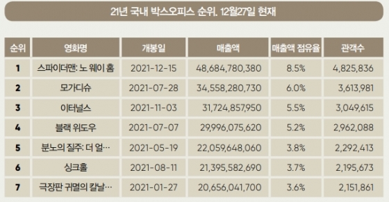 2021³â Å©¸®½º¸¶½º ¿¬ÈÞÀÎ 26ÀϱîÁö °ü°´ ¼ö´Â 482¸¸5000¿© ¸í. ±ØÀå ¿Ü µðÁöÅÐ ÆÇ±Ç ¸ÅÃâÀÌ ±Þ¼ºÀåÇϰí ÀÖ´Â Á¡À» °¨¾ÈÇϸé, ÃÖÁ¾ ±ØÀå ½ºÄÚ¾î¿Í »ó°ü¾øÀÌ ¹«³ÇÏ°Ô <½ºÆÄÀÌ´õ¸Ç> ½Ã¸®Áî ÃÖ´ë ÈïÇàÀÛ¿¡ µî±ØÇÒ Àü¸ÁÀÌ´Ù.