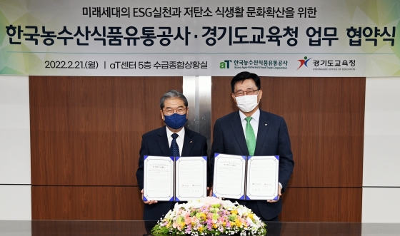 Çѱ¹³ó¼ö»ê½ÄǰÀ¯Åë°ø»ç¿Í °æ±âµµ±³À°Ã»(±³À°°¨ ÀÌÀçÁ¤)Àº 21ÀÏ ¼¿ï aT¼¾ÅÍ¿¡¼ ¾÷¹«Çù¾àÀ» ü°áÇÏ°í ¡ãÀúź¼Ò ½Ä»ýȰ Ä·ÆäÀÎ ¡®ÄÚ¸®¾Æ ±×¸°Çªµå µ¥ÀÌ¡¯ ÃßÁø¤ýÈ®»ê ¡ã±âÈÄÀ§±â ´ëÀÀ ±³À°±Þ½Ä µî ESG ½Çõ »ýÈ°È ±³À°¤ýÈ«º¸ ¡ãÀúź¼Ò¤ýģȯ°æ ³ó¼ö»ê½ÄǰÀ» Ȱ¿ëÇÑ Çб³±Þ½Ä Ȱ¼ºÈ µî¿¡ Çù·ÂÇϱâ·Î Çß´Ù.