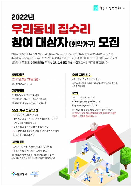 15ÀÏ ±¸¿¡ µû¸£¸é û³â°ÇÃàÇб³ Âü¿© ±³À°»ý°ú '¿ì¸®µ¿³× Áý¼ö¸® Áö¿ø»ç¾÷'À» ÁøÇàÇÑ´Ù. û³â°ÇÃàÇб³ÀÇ Áý¼ö¸®¡¤ÀÎÅ׸®¾î ±³À°°úÁ¤¿¡ Âü¿© ÁßÀÎ ±³À°»ýµéÀÌ Àü¹®°¡¿Í ÇÔ²² ÁÖ°Å Ãë¾à°èÃþÀ» À§ÇÑ ¸ÂÃãÇü Áý¼ö¸®¿¡ ³ª¼±´Ù. ÃÖ´ë 150¸¸ ¿ø±îÁö Áý¼ö¸® ºñ¿ëÀ» Àü¾× Áö¿øÇÑ´Ù.