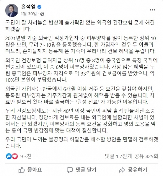 ¿Ü±¹ÀÎ °Ç°º¸Çè¿¡ ´ëÇÑ ¡®¿ø¼º¡¯ÀÌ ³ô¾ÆÁöÀÚ À±¼®¿ ´ëÅë·É ´ç¼±ÀÎÀÌ Èĺ¸ ½ÃÀý ÀÌ ¹®Á¦¸¦ ¾ð±ÞÇß´Ù. À± ´ç¼±ÀÎÀº Áö³ 1¿ù 30ÀÏ ÀÚ½ÅÀÇ ÆäÀ̽ººÏ¿¡¼ ¡°±¹¹ÎÀÌ Àß Â÷·Á³õÀº ¹ä»ó¿¡ ¼ù°¡¶ô¸¸ ¾ñ´Â ¿Ü±¹ÀÎ °Ç°º¸Çè ¹®Á¦¸¦ ÇØ°áÇϰڴ١±°í ¹àÇû´Ù. ¿Ü±¹ÀÎ °Ç°º¸Çè Á÷Àå°¡ÀÔÀÚÀÇ ÀϺΰ¡ ¾Æµé, ¸ç´À¸®, ¼ÕÀÚµé±îÁö ÇǺξçÀÚ·Î µî·ÏÇØ ¿ì¸®³ª¶ó °Çº¸ ÇýÅÃÀ» ´©¸®°í ÀÖ´Ù¸ç, Çö Á¦µµ ¾È¿¡¼´Â ¿Ü±¹ÀÎÀÌ Ä¡·á¸¸ ¹ÞÀ¸·¯ ±¹³»¿¡ µé¾î¿Ô´Ù ¹Ù·Î Ãâ±¹ÇÏ´Â ¡®¿øÁ¤ Áø·á¡¯°¡ °¡´ÉÇÏ´Ù°í ÁöÀûÇϸ鼴Ù. ±×·¯¸é¼ ¿ì¸® ±¹¹ÎÀÌ ´À³¢´Â ºÒ°øÁ¤°ú ÇãÅ»°¨À» ÇØ¼ÒÇÒ ¹æ¾ÈÀ» ¸é¹ÐÈ÷ °ËÅäÇϰڴٰí Çß´Ù. ÀÌ¿¡ ´õºÒ¾î¹ÎÁÖ´çÀº ¿Ü±¹ÀÎ °Çº¸ ÀçÁ¤ ¼öÁö¸¦ ÀοëÇØ À± ´ç¼±ÀÎÀÇ ÁÖÀåÀº ¡®°¡Â¥´º½º¡¯¶ó¸ç ¿Ü±¹Àο¡ ´ëÇÑ Çø¿À¸¦ Á¶ÀåÇÑ´Ù°í ºñÆÇÇß°í ¿©¾ß °£ ³íÀïÀ¸·Î ºñȵDZ⵵ Çß´Ù.